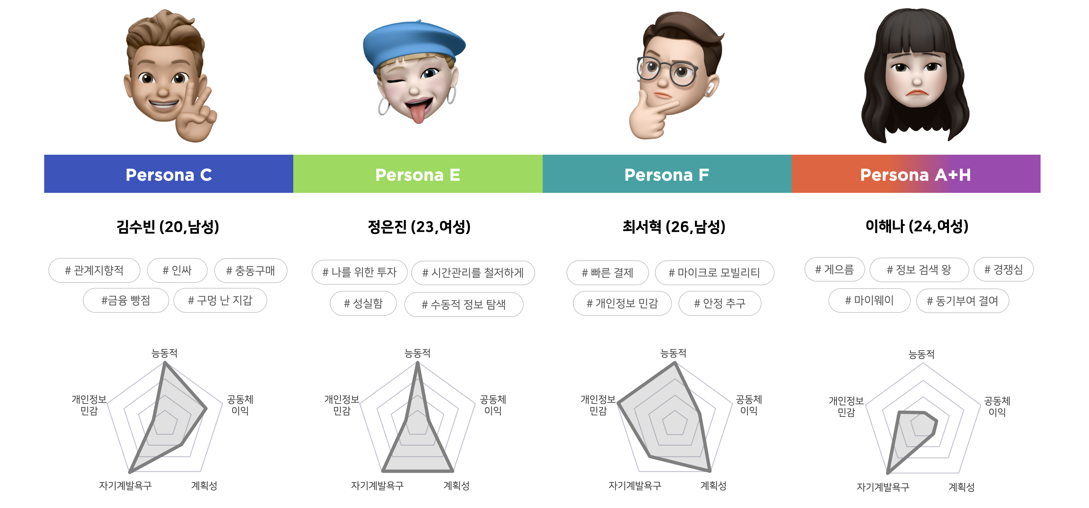이러한 과정을 거쳐 완성된 4명의 Persona는 다음과 같다. 이들의 특징을 다각형 다이어그램으로 정리해보니 그 특징이 확연히 보였다.