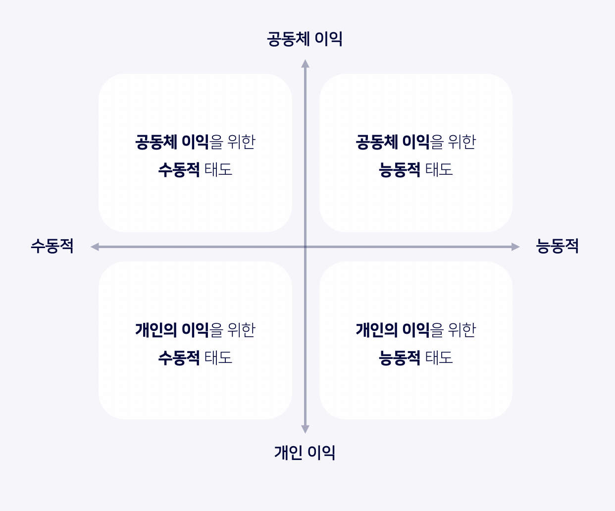 유사한 Persona는 아이디어를 내는 것에 큰 장애물이 된다. 이런 점을 지양하기 위해 이전 분석과정에서 진행한 <행동성향 그래프>을 이용해 유사한 행동 패턴을 지닌 타입을 그룹을 지었다. <공동체↔개인의 이익>과 <수동적↔능동적 행동>에 맞춰 배치한 결과 개성이 있는 A, C, E, F, H형의 행동 패턴을 선정할 수 있었다.