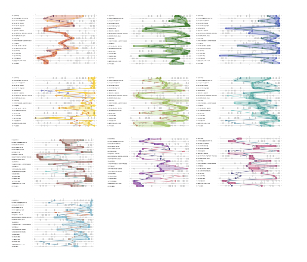 가로로 긴 그래프 안에 (12명 사용자의) 행동 정도를 매핑해야 한다. 일반적으로 그래프는 정량적 데이터를 시각화하는 것이다. 하지만 우리가 진행한 인터뷰와 다이어리 리서치는 정성적인 데이터를 얻는 리서치다. 비정형 데이터인 사용자의 행동(패턴)을 그래프로 표현하기란 참으로 어렵다. (정성적 정보를 시각화하기 위해 사용한 방법이었지만, 아이러니하게도 이를 다루는 것에 어려움을 느꼈다.) 또한 개인의 견해가 강하게 대입되고, 특정 행동이 강조되어 맥락이 무시될 수 있다.
