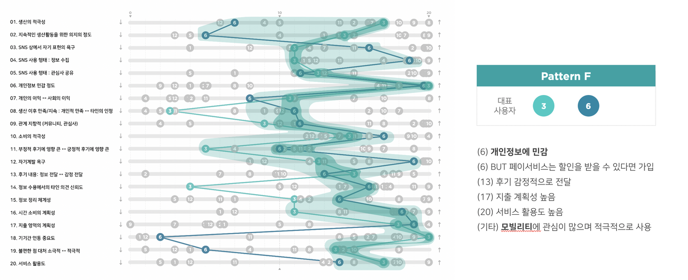 유사한 그래프 형태를 보이는 사용자들을 각각 묶은 후 패턴에 따라 색을 칠했다. 공통된 패턴을 보이는 사용자(인터뷰이)들의 공통점을 기록했다. 총 10개의 행동 패턴을 발견했으며, 이 패턴을 기반으로 4~5명의 Persona를 설정하는 것을 목표로 했다.