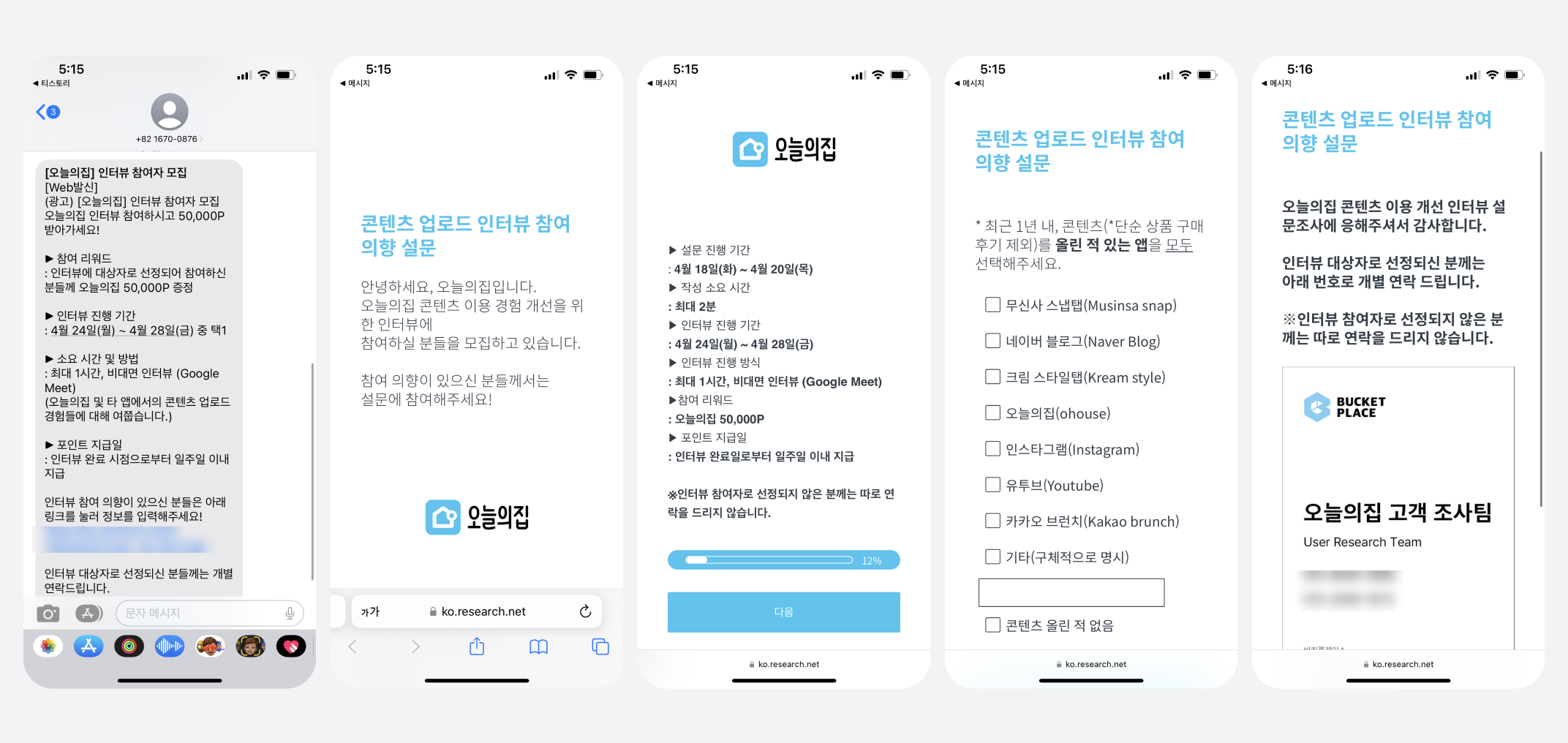 오늘의 집은 문자 메시지를 통해 인터뷰 참여자를 모집한다. 문자 메시지에는 참여 리워드, 인터뷰 진행 기간, 소요시간 및 방법에 대해 안내되고 있다. 설문에서는 콘텐츠 업로드 경험에 관한 응답을 받았다.