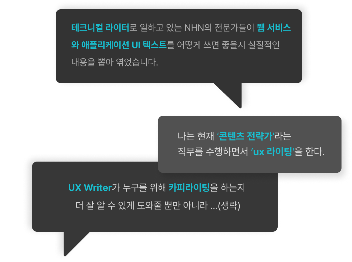 | UX 라이팅 (UX Writing) | 카피 라이팅 (Copy-writing) | 테크니컬 라이팅 (Technical Writing) |